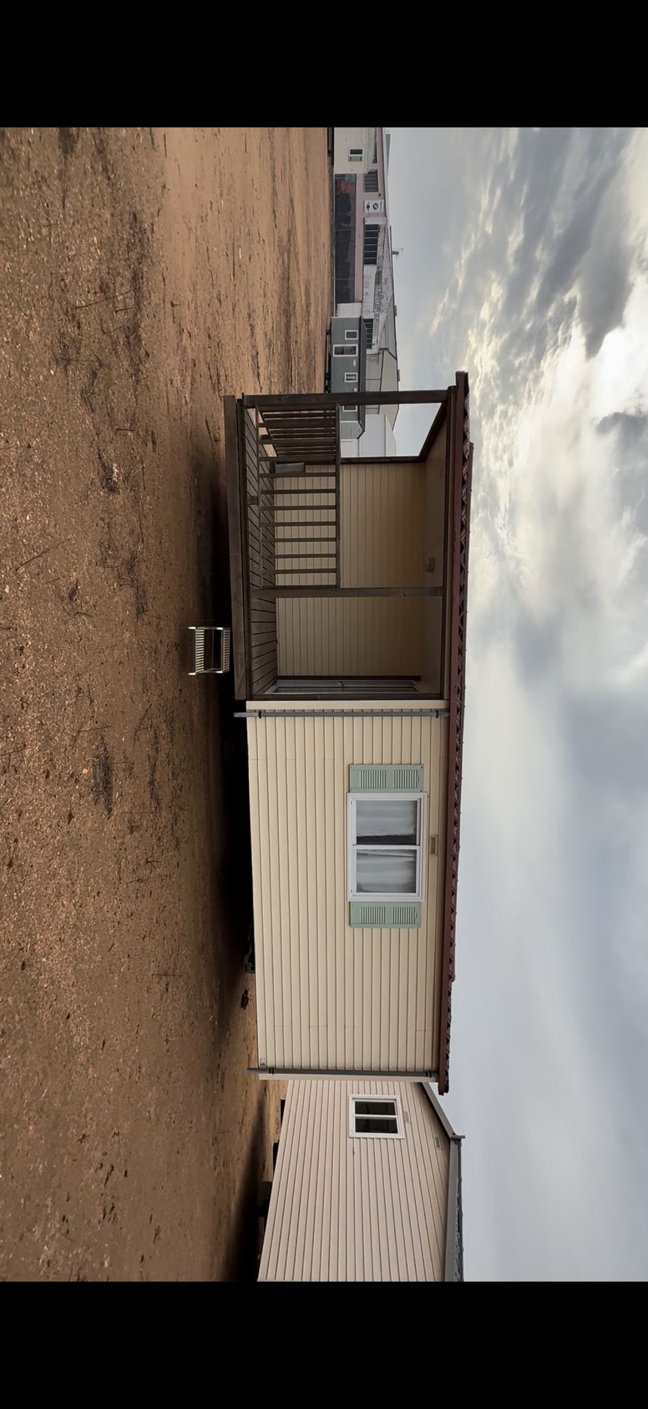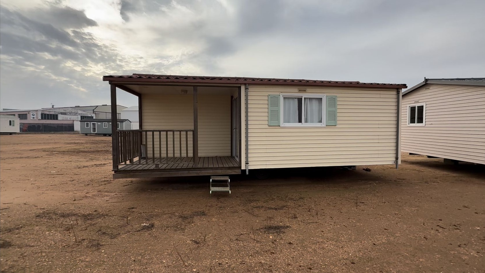 Casa prefabricada con porche de madera, fabricada con estructura revestida en PVC y aislamiento de panel sándwich, ideal como vivienda económica, casa de campo o alojamiento auxiliar.